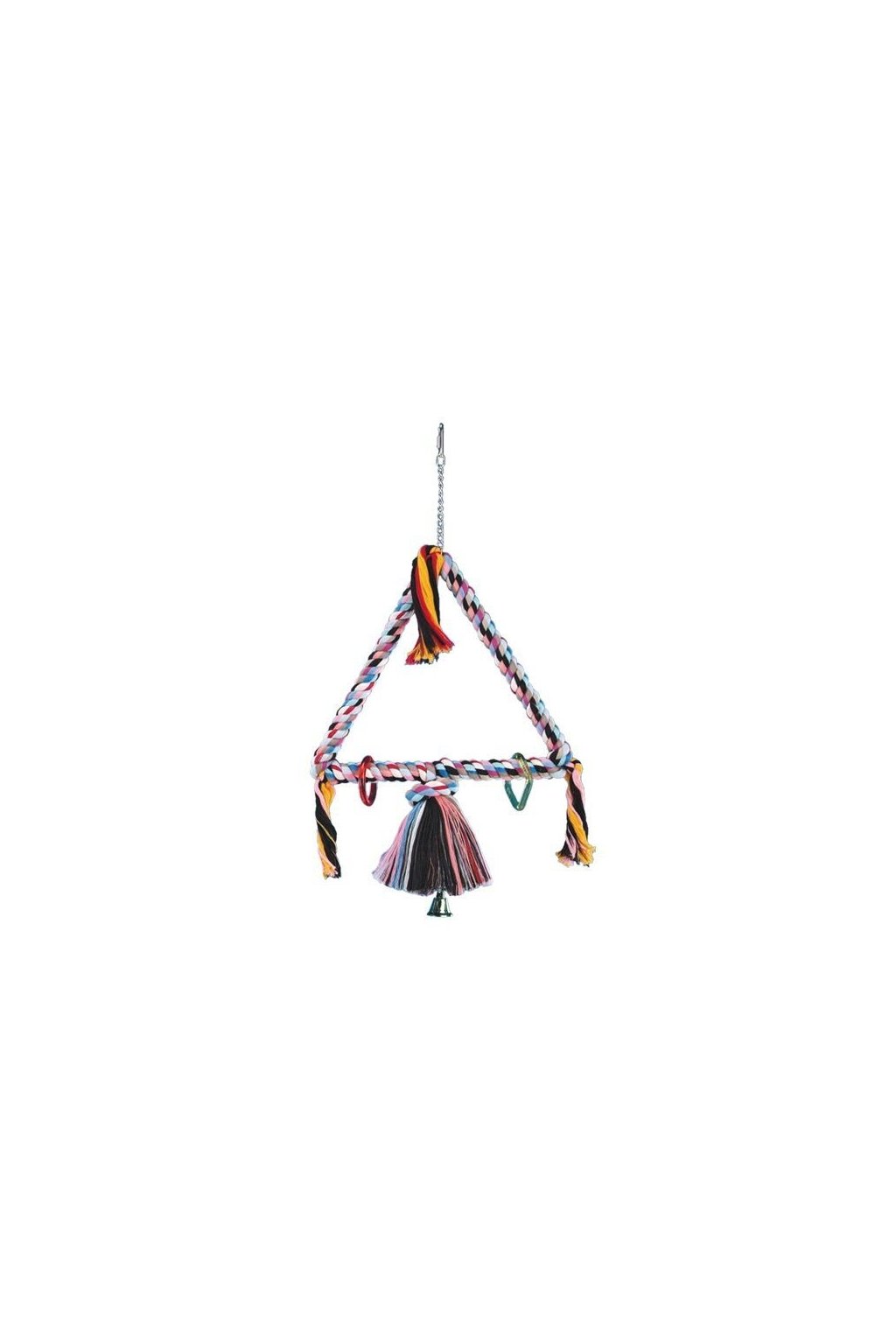 Bavlněný barevný triangl s třásněmi a zvonečkem. Vhodné pro velké papoušky. Délka strany trojúhelníku 45cm, průměr lana 3cm.